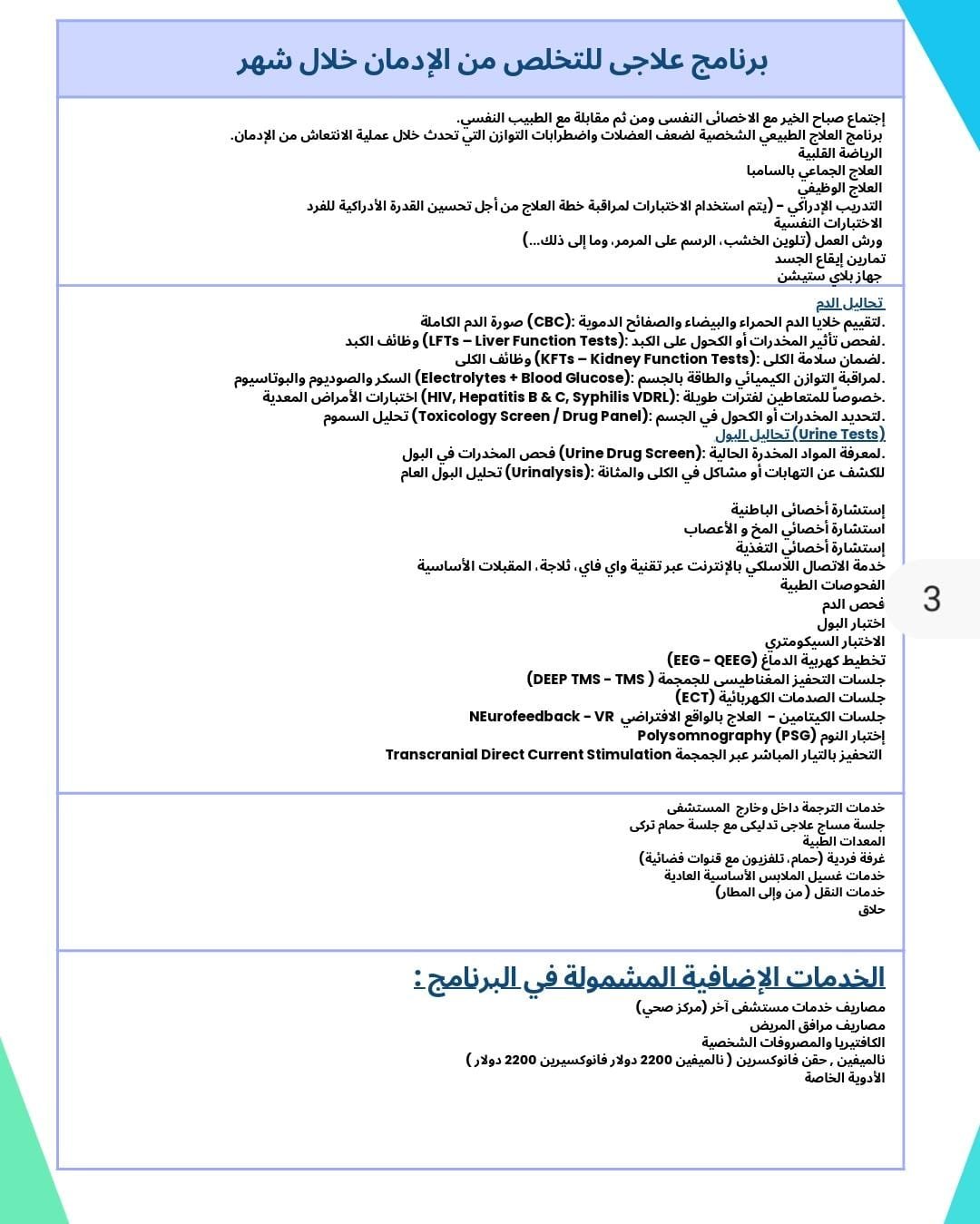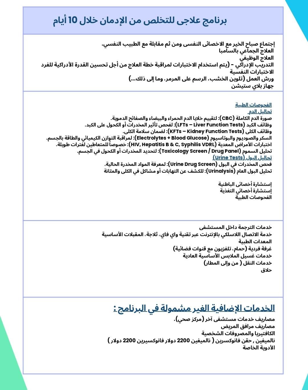برنامج متابعة ما بعد العلاج (Aftercare Program): يشمل متابعة دورية مع الطبيب، مكالمات دعم، وخطط وقائية ضد الانتكاس.