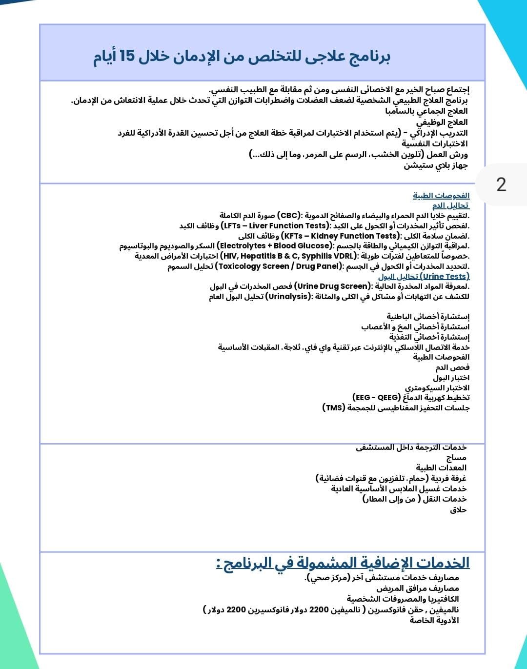 التكلفة تختلف حسب نوع البرنامج (داخلي/خارجي) ومدة الإقامة والفحوصات المطلوبة.